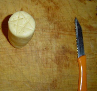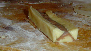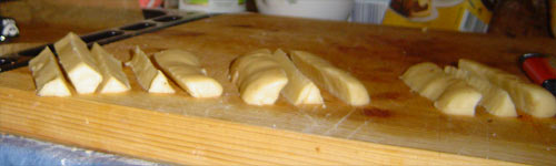Und nun wird mit scharfem Messer abgeschnitten, die Scheiben werden zu den Keksen.