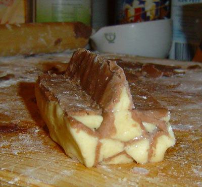 Mürbteig mit Kakao wird ganz dünne ausgerollt. Hab ich kein Bild von,