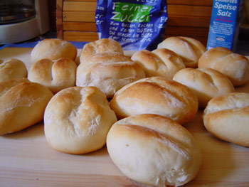 PS: Verzeiht mir, dass ich aus dem Brötchenbacken eine derart wissenschaftliche Abhandlung gemacht habe *g* Wenn ihr statt Schrippen zb. "Hamburger Rundstücke" machen wollt, lasst ihr das eindrücken und Würstchenrollen weg, dann werden die Bällchen einfach ordentlich gehen gelassen und dann gebacken. Wissenswert ist noch, dass Butter und Zucker geschmacklich nicht viel ausmachen, die tut man aus backtechnischen Gründen rein: Der Zucker gibt einen Tick mehr Nahrung für die Hefe, und das Fett macht den Teig elastischer so dass er beim Gehen mehr Gärgase halten kann, und die Brötchen ein grösseres Volumen kriegen.